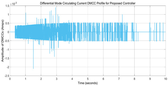 For a more generic comparison performance, the case study from literature reference [24] is considered, where the same case of parallel-connected power electronics converters is shown for circulating current control. Two different control schemes, i.e., the droop control method and the sliding-mode control method, are presented to control circulating currents and load power sharing amongst parallel-connected modules. A comparison is presented in terms of circulating current elimination, where the sliding-mode control presents better results (with circulating current value of ±0.05 A) than the droop control method (with circulating current values of ±1 and ±0.2 A). The comparison of these control scheme values with the values of our proposed control scheme (circulating current value of ±0.005 A, shown in Figure 19) shows the performance superiority of our proposed control scheme.