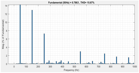 In addition, the THD analysis for the comparison study performed between our proposed control scheme and the AICMC control scheme was also considered. The THD profile for AICMC control is shown in Figure 21. In the case of AICMC, the THD for the system under consideration is 15.67% which provides a power factor of about 0.9. Thus, by comparing Figure 21 with Figure 15, it can be concluded that our proposed scheme is not only effective in eliminating circulating currents, but also in eliminating the harmonics distortion factor. Taking Equations (40) and (41) into account, a higher power factor is maintained in terms of using our proposed control scheme as compared to the AICMC control scheme.