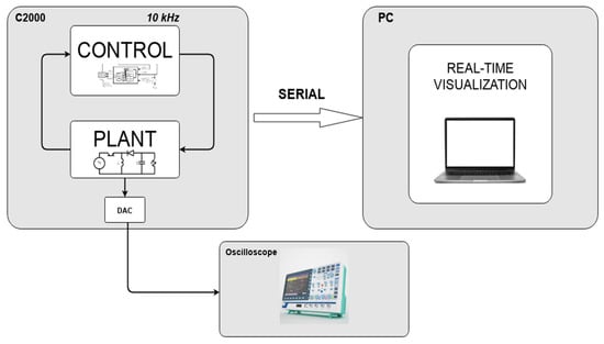 The whole process of validation of our control scheme along with the converter plant model is shown in Figure 22. Both the control algorithm and the plant model were implemented on the microcontroller to be executed at 10 kHz. Noise is added to the inputs of the control block to compensate for the fact that these are not physical signals. At each sampling time, the state of the PFC is visualized via serial communication or using the on-chip digital-to-analog converters (DACs). The results obtained for this real-time digital hardware validation of our proposed system are shown in Figure 23, Figure 24, Figure 25 and Figure 26.