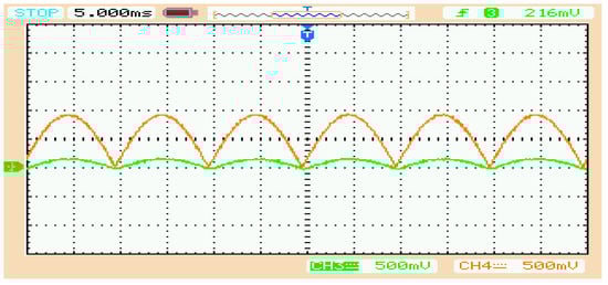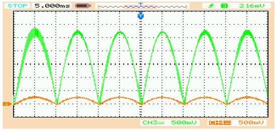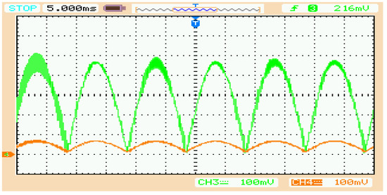 Rectified input supply voltage profile (in orange) along with inductor/line current (in green) for the same value of inductors in parallel-connected converters.