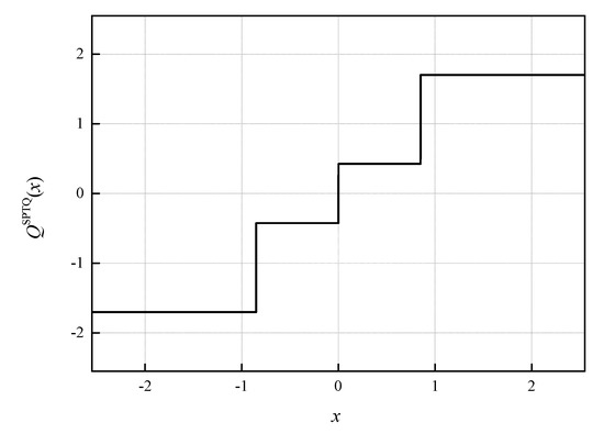 Transfer characteristic of two-bit SPTQ QSPTQ(x) for [™xmaxSPTQ, xmaxSPTQ] = [™2.5512, 2.5512].