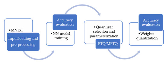 For the specified NN model, training, accuracy analysis and quantization have been implemented in Python programming language [28]. In our QNN model, all trained weights have been quantized using one of the proposed novel NUQs (SPTQ or MSPTQ) and our QNN model’s accuracy, as well as SQNR, has been evaluated for compressed/quantized weights to represent post-training two-bit NUQ (SPTQ or MSPTQ) performance (see Algorithm 1). We can evaluate the experimental performance of SPTQ and MSPTQ by determining the distortion or SQNR, defined similarly as in [19]: