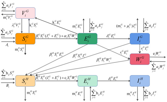 In Figure 2, the superscript G and H represent sheep and human, the subscript i and j represent patch i and patch j, respectively. The number of susceptible, exposed, infected and vaccinated sheep are indicated by , , , . Meanwhile, the numbers of susceptible, exposed, and infected humans are represented by , , . The brucella amount in the environment is . The meaning of other parameters is shown in Table 1, in which parameters , , , , , , , , , ,,, , , , are nonnegative constants. Based on the above assumption, a dynamical model of brucellosis transmission between sheep and human is established as follows.