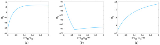This paragraph analyzes the influence of transportation coefficient on the basic reproduction number . Firstly, when the transportation rates of sheep in both patches are the same () and the other parameters are the same as Figure 3, we found that with the increase of a, the basic reproduction number increased (see Figure 5a). This means that, with the increase of transportation of sheep, the disease will breakout. Secondly, when the transportation from Jalaid banner to Ulanhot is zero, the basic reproduction number no matter how much a is (see Figure 5b). This reveals that the transportation of sheep from Ulanhot to Jalaid could not make the disease epidemic between the two places. We also find that the basic reproduction number first increases and then decreases with the increase of a from Figure 5b. This is because the number of sick sheep in Ulanhot is much smaller than that in Jalaid banner. When there is only transportation from Ulanhot to Jalaid banner, the rate of exposed and infectious sheep in Jalaid banner could be reduced, and then the basic reproduction number could be reduced. However, when the basic reproduction number decreases to a certain extent, the rate of exposed and infectious sheep in Jalaid banner and Ulanhot tends to be the same. At this time, further transportation will slightly increase the basic reproduction number . Finally, when the transportation from Ulanhot to Jalaid banner is zero, the basic reproduction number increases rapidly with the increase of a (see Figure 5c), and the increase amplitude is higher than Figure 5a. This shows that the transportation of sheep from Jalaid banner to Ulanhot is a critical factor for the prevalence of brucellosis in the two places.