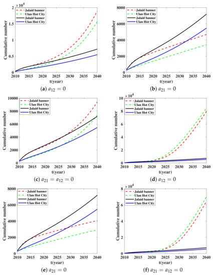 In this paragraph, we study the influence of the transportation coefficient on the cumulative number of new infections. From a practical point of view, people with brucellosis could move everywhere. However, we often slaughter sheep with brucellosis. This leads to the fact that few sheep with brucellosis could be transported between patches. Considering inhibiting the transportation of infected sheep from Ulanhot to Jalaid in each patch, we set for the third and the 11th equations of system (1). Figure 6a shows that when this transportation ban policy appears, the cumulative number of human with brucellosis will increase in the next years. Then we set for the third and the 11th equations of (1) when the transportation of infected sheep from Jalaid to Ulanhot is prohibited in each patch. For Figure 6b, when this transportation ban policy is executed, the cumulative number of humans with brucellosis will decrease in the next years. Thirdly, we set for the third and the 11th equations of (1) when there is no transportation of infected sheep between the two places. We could see from Figure 6c that when this transportation ban policy appears, the cumulative number of human with brucellosis will increase. We consider a more ideal situation, which is that the exposed and infected sheep and the bacteria in the environment will not be transported. We set for the second, the third, fifth, 10th, 11th and 13th equations of (1). We could see from Figure 6d that when this transportation ban policy appears, the cumulative number of humans with brucellosis in Ulanhot and Jalaid will increase. Similarly, we set for the second, third, fifth, 10th, 11th and 13th equations of (1). Figure 6e shows that when this transportation ban policy appears, the cumulative number of humans with brucellosis in Ulanhot and in Jalaid banner will decrease. Finally, we set for the second, third, fifth, 10th, 11th and 13th equations of (1). According to Figure 6f, we find that, when this transportation ban policy appears, the cumulative number of human with brucellosis in Ulanhot and Jalaid banner will increase.