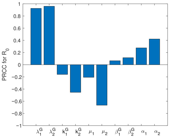 The PRCC (Partial Rank Correlation Coefficient)-based sensitivity analysis evaluates the influence of parameters on the basic reproduction number . Here, PRCC values of some parameters are given based on Latin Hypercube Sampling [41]. We take the sample size . The , , , , , , , , and are considered to be input variables, which mean value are shown in Table 2. Furthermore, the values of are the output variables. We assume that all parameters are uniformly distributed and the respective standard deviations of and are 0.01, and . The magnitude of the partial rank correlation coefficient value of each input parameter with respect to the basic reproduction number is proportional to the correlation of this parameter to . That is, the larger the bias correlation coefficient of this parameter is, the greater the influence of this parameter on is. We can see from Figure 7 that ,, , , and are positively correlated with , and , , and are negatively correlated with . This further shows that vaccination and capture of the sheep with brucellosis are effective means to control the disease. We could further find that is the most sensitive to the values of and from Figure 7. This shows that improving vaccine efficiency is the best way to prevent brucellosis. At the same time, strengthening the vaccination rate, killing sick sheep and disinfecting the environment are effective means to prevent and control brucellosis. Considering the effect of and on is slightly greater than that of and , we believe that timely killing of sheep with brucellosis is more effective than vaccination.