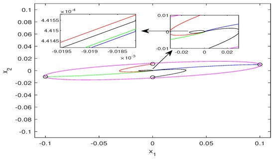 four trajectory curves in the domain of attraction are shown in Figure 1, which are asymptotically driven to the origin under the controller. Therefore, this shows that the designed controller is effective.