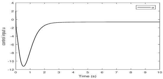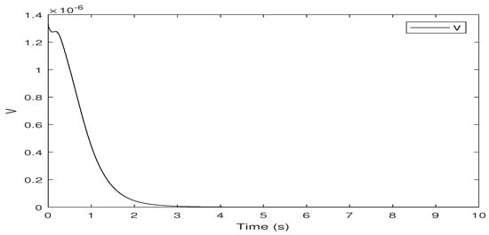 From the starting point , the response trajectories of the states, Lyapunov function and control input are shown in Figure 2, Figure 3 and Figure 4, respectively. Therefore, the closed-loop system (30) is locally asymptotically stable with disturbance attenuation level under the controller (9).