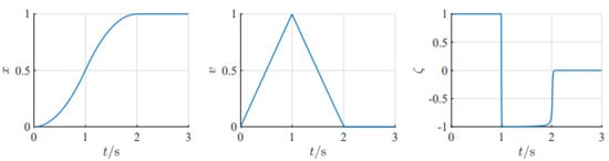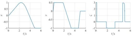 At the initial moment, x(0) = 0, v(0) = 0 the upper limit of available acceleration is and the lower limit of available acceleration is . The speed limits are and , respectively. Computer simulation with a length of 6 s and simulation step of 2.5 × is carried out, and a simulation curve was obtained as shown in Figure 5.