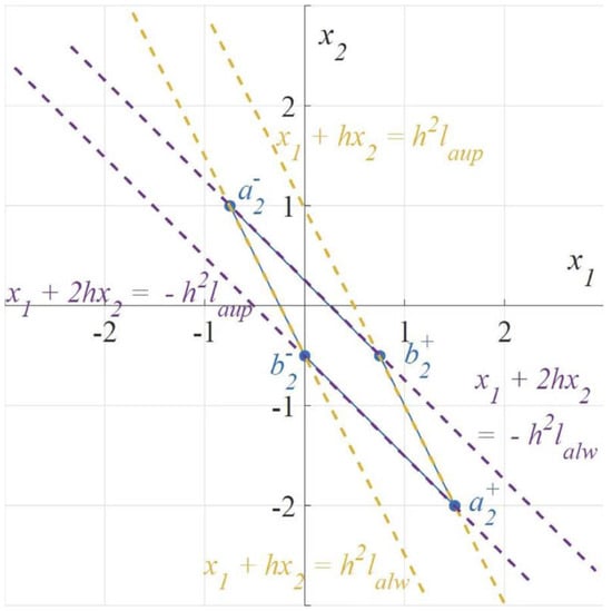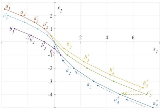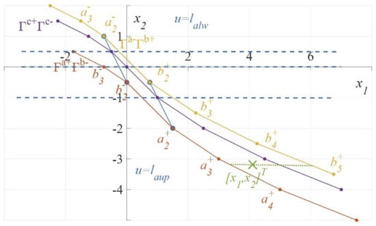 Then consider the case where the minimum number of steps is larger than two. If the initial point is on , the state variable can return to the origin at the fastest speed by applying control quantity continuously. If the initial point is on , then the control quantity applied in the first step causes the state variable to fall on after the first step. Then the control quantity can be applied continuously to make the state variable return to the origin during the following (k − 1) steps. For example, the initial point of the system state is , then it falls to the point after the first step and then returns to the origin along the . If the initial point is on , then the control quantity u=0 applied in the first step causes the state variable to fall on after one step. Then the control quantity can be applied continuously to make the state variable return to the origin during the following (k − 1) steps. For example, the initial point of the system state is , then it falls to the point after the first step and then returns to the origin along the . For the case where the initial point is located at , there are similar conclusions, which will not be discussed repeatedly. Obviously, if the initial point is located in the region below the polyline , the control quantity of the first step should be . If the initial point is located in the region above the polyline , the control quantity of the first step should be . See Figure 4.