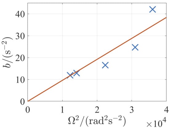 where η is used to adjust the filter bandwidth, the coefficient can be measured by experiment or calculated by simulation. For the above example, when the main rotor speed is 141.37 rad/s (1350 rpm), the simulation results show the relationships and linear fitting lines between the body mass and the collective pitch input under various load conditions when hovering, as shown in Figure 14, and mkg·rad−3 is obtained through calculation.
