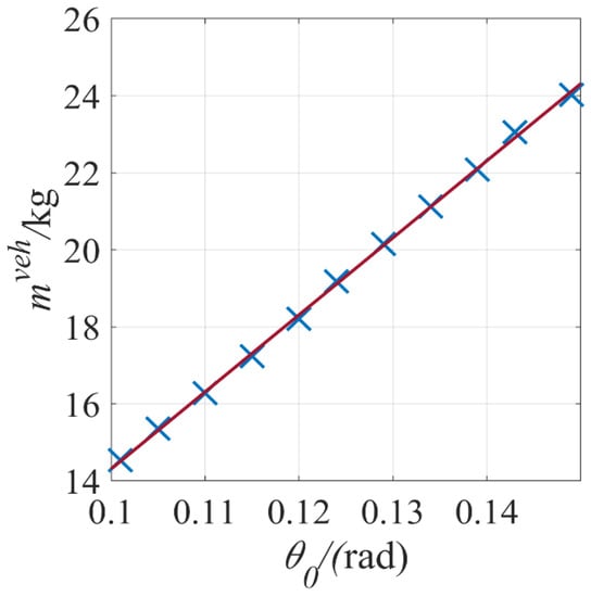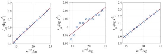 It can be seen from Table 2 that IXX, Iyy and Izz are in an approximately linear relationship with mass mveh. The least square fitting is carried out, and the equation of the fitting line obtained is shown as Equations (62)–(64). Where the unit of IXX, Iyy and Izz is kg·m2, and the unit of mveh is kg. Data points and fitting lines are shown in Figure 13.
