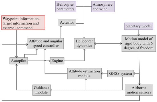 The simulation system is shown in Figure 15. As static variables, helicopter parameters, atmospheric and wind data, planetary model parameters are called by the simulation programs during run−time. The helicopter parameters include the mass, size, main rotor, tail rotor installation position and geometric parameters, rotational inertia matrix and so on. Based on the research content of Section 2, the helicopter dynamics module takes the output of the main rotor and tail rotor control actuators and the motion state of the helicopter as input, calls the helicopter parameter table and atmospheric data, and calculates the flapping motion of the rotor according to its flapping kinetics. The aerodynamic force on the helicopter is calculated according to the force and moment calculation formula. Its internal structure is shown in Figure 16. Firstly, coordinate transformation is carried out according to the body attitude parameters and rotor installation data, and the component matrix of the relative airflow velocity of main rotor and tail rotor in the hub coordinate system is obtained. Then, according to the flapping motion equation of the main rotor, Equation (8), take the flow velocity and control pitch in the hub coordinate system as input, and work out the flapping motion of the main rotor. According to Equations (19)–(24) and (37)–(40), the forces and torques generated by the main rotor and tail rotor are calculated and output after synthesis. According to the rigid body dynamics and kinematics equations, the “real” motion state of the helicopter relative to the reference coordinate system was calculated by taking the force and moment output from the helicopter dynamics module as input. According to the measurement of “real” motion state by sensor and GNSS module, the attitude estimation module uses the CGD attitude estimation algorithm in Section 3 to estimate the attitude of helicopter. The autopilot takes GNSS module measurement, pre−stored waypoint information and target state as input, and calculates the reference attitude Angle and angular velocity by using the guidance algorithm described in Section 4. The attitude and angular rate controller take the measurement of airborne motion sensor, the attitude estimation value of the fuselage output by the attitude estimation module and the reference attitude Angle and angular velocity output by the autopilot as input, and generates the actuator instructions according to the attitude control method discussed in Section 5. The actuator generates the control pitch of the main rotor and tail rotor according to the commands, and outputs to the helicopter dynamics module to form a closed loop.
