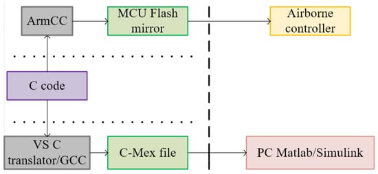 All algorithms are programmed with C language, and the same code is used for mathematical simulation and computer control system. For mathematical simulation, C-MEX files are generated by a VSC/C++ compiler and run in a Matlab/Simulink. The same code and the Arm embedded development tool chain are used to generate Flash images which are suitable for MCU in the airborne controller for actual flight or HIL simulation. See Figure 17.