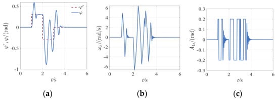 ATD-falESO attitude controller is constructed by mapping ATD reference trajectory generator and falESO disturbance observer with constant feedback gain. For ATD, set the speed limit as , , and acceleration limit is , . The control gain coefficient of falESO is set as b = 170 according to the simulation results. The generated change process of roll Angle , angular velocity and control quantity are shown in Figure 19.