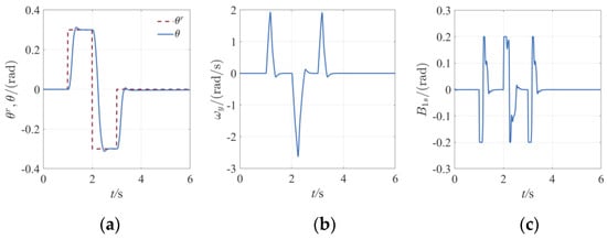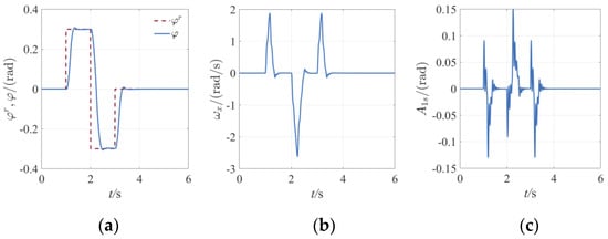 By comparison with Figure 18a,c, it can be seen that after the step change of reference attitude Angle , the output of the control quantity maintains the maximum ±0.2 rad in a short time because the feedback gain coefficient is large. When approaching the reference value 0.3 rad/s, then decelerate with Due to the saturation limit of actuator, the energy accumulated during acceleration motion of helicopter attitude cannot be dissipated in a short time, resulting in obvious overshoot. This phenomenon is more obvious when t = 2 s, the step amplitude of the signal is doubled. As can be seen from Figure 18b, the control quantity jumps between the maximum and minimum values, resulting in significant changes in the angular velocity along axis of the body. The absolute value of the maximum angular velocity is greater than 6 rad/s, which requires a large range of airborne gyroscope to realize a safe control process.