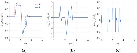 According to Figure 20a and Figure 21a, similar to the rolling direction, the control response is significantly improved because the reference transition process includes high−frequency information. In comparison to Figure 19a, it can be seen that the reference transition trajectory information generated under the same circumstances is also the same due to the identical ATD parameters. Therefore, the ATD-falESO controller produces very similar transition processes in the pitch and roll channels. In addition, because falESO disturbance observer has a faster response speed, the influence of accumulated errors on the transition process is obviously weakened after it is introduced into the controller. As can be seen from Figure 21c, although the output of the controller is saturated with the increase of the moment of inertia, since the reference trajectory already contains definite acceleration and deceleration stages, the controller saturation does not cause an obvious increase in overshoot quantity. Lateral loop pitch has no obvious back and forth adjustment process, which means higher efficiency than PID controller.