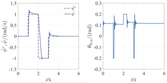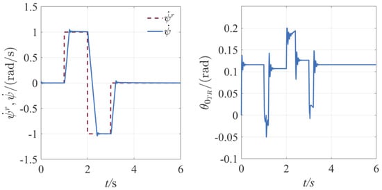 Due to the acceleration limitation capability of ATD, the generated reference trajectory of yaw angular velocity has the same change rate in both positive and negative directions of . The yaw motion of the fuselage has the same performance in both directions even when subject to anti-torque of main rotor.