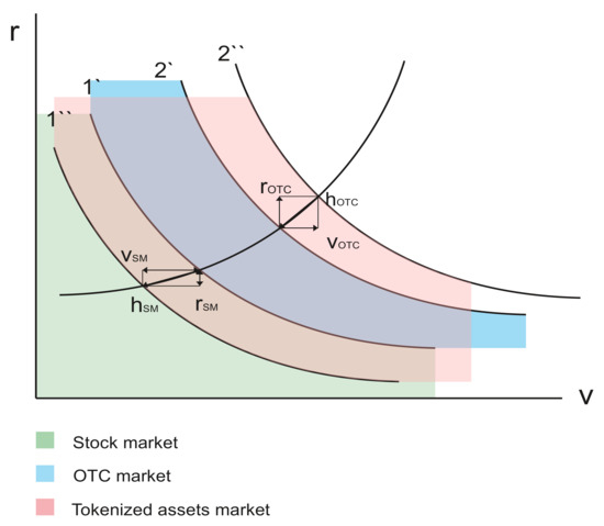 In the case of long-term investments, the transition from the OTC market to the stock market below the demand curve 1′ (Figure 1) enables a reduction in the cost of raised capital through access to a wide range of investors via public offering; however, it is associated with the need to overcome such stock market barriers as the minimum issuance amount, financial performance requirements for the company attracting investment, as well as requirements for the growth rate and ownership structure of the company. The boundary between the r(V) regions of the stock and OTC markets 1′ can shift in the direction of the curve 1” at lower barriers when issuing tokenized financial instruments as compared to the stock market barriers. For each point on the curve 1′, the shift vector hSM is determined by the vector VSM characterizing the amount of investment raised in the stock market that is substituted by investment raised through the issuance of tokenized assets, as well as the vector rSM characterizing a reduction in returns in the stock market at the same investment level due to this substitution: