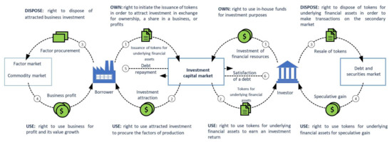 File access rights in the operating system fall into two categories: actions and user groups. The following action options are supported: read-read-only access; edit-file modification is permitted; execute-access to the file authorizes the execution of programs or scripts contained in the file. These actions are differentiated for different groups of users: the user is the owner of the computer or site where the files are located; the group includes other users who have access to the files approved by the user; the world here implies any other user who has access to the files. The rights of access to tokens for underlying financial assets can be considered by analogy with the file access rights in a computer operating system. Thus, the rights involving tokens for underlying financial assets include the rights to own, dispose of, and use these tokens in the financial market transaction cycle (Figure 2). The transfer of these rights is shown in Figure 2.