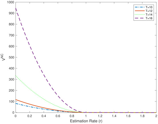 Based on Propositions 1 and 2, a numerical example is demonstrated to analyze the influence of various cases of estimation. The parameter values are assigned randomly; let us denote for both cases. Specifically, in our example, we compare four different plots with ending times and 16.