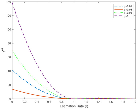 Normalized value of information for varied estimated initial pollution stock under different coefficient when (X-axis denotes the estimation rate, Y-axis denotes the value of ).