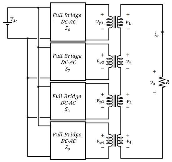 The transformer-based cascaded multilevel inverter shown in Figure 1 is composed of four full-bridge converters, which perform the DC-AC conversion from the control applied to their semiconductors [1]. Each of the inverter stages is isolated from the others by a low-frequency transformer. In this way, adding the signals in the secondaries of the transformer ( v 1 ( t ) + v 2 ( t ) + v 3 ( t ) + v 4 ( t ) = v o ( t ) ) gives the different output levels to produce a steeped signal with properties close to those of a pure sinusoidal signal. The more levels the multilevel inverter is capable of producing, the greater the similarity to the pure sinusoidal signal and the lower the total harmonic distortion (THD). When using a common power supply, the inverter can be symmetrical or asymmetrical depending on whether the turns ratios of the transformers are the same or different, respectively.