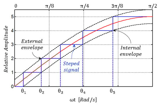 To build the output signal depicted in blue color in Figure 2, the switches of the H-bridges of the inverter stages are commuted according to a switching pattern. Each level is held during a time interval in which we can define two time instants (firing angles), the time at which the interval starts and the time at which the interval ends. In consequence, the instant corresponding to the end of one interval is the same as the one in which the next interval starts. As a result of the symmetry of the produced signal, there are intervals with the same time duration. Considering the first quarter-cycle of the waveform in which the levels are increasing following a positive sequence (1, 2, 3…, M), it is possible to identify two sinusoidal envelopes, one above the square signal (external) and another below (internal). In the context of the work presented in this paper, if a pulse is aligned with the external envelope, it is considered that the pulse has outward alignment. Contrarily, if a pulse is aligned with the internal envelope, it is considered that the pulse has inward alignment. In Figure 2, the red color signal is the ideal sinusoidal reference to produce the output voltage.