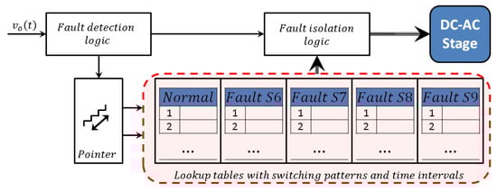 The control of the inverter can be divided into two parts, one corresponding to operation in normal conditions and another corresponding to operation in faulty conditions. Integration of these two parts implies the implementation of a fault detection logic which provides information to the generator of the control signals of the H-bridges of the inverter and also to a complementary logic dedicated to imposing the isolation to the fault condition. Both the normal operation switching pattern and the faulty operation switching patterns are implemented by using lookup tables which are reproduced into a digital controller according to the fault detection logic. A block diagram containing the above described blocks for one of the stages of the inverter is shown in Figure 3. When a fault is detected, the isolation logic inhibits the control signals of the faulty stage and enforces a short circuit in the output using the same power semiconductors of the bridge or using an additional bidirectional switch connected at the output on the H-bridge. In a previous work, we proposed a method for the detection of inverter faults by means of machine learning techniques [22].