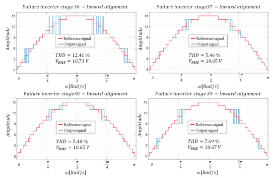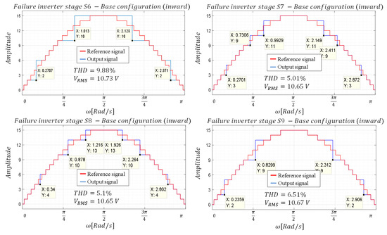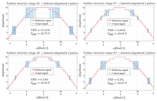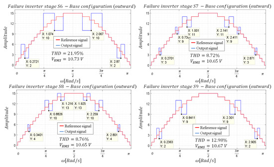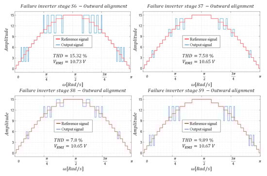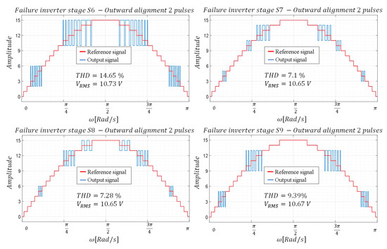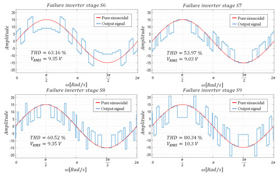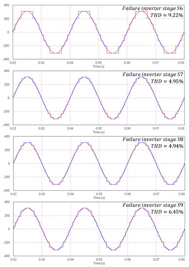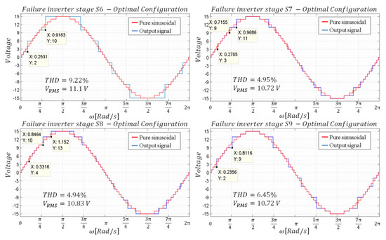 Table 4 presents the comparison of the THD obtained with the different methods, verifying that the optimization provided the best possible result. As can be seen, the most favorable THDs correspond to the failures of inverter stages S 7 and S 8 while the worst case corresponds to the failure of inverter S 6 . Figure 13 shows the waveforms obtained with the proposed optimization.
