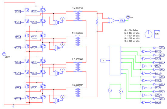 To validate the results obtained for the best configuration, the simulation shown in Figure 14 was built using PSIM software. The simulation considers that the inverter has an input voltage of 48 V, produces an output voltage of 220 V and feeds an output load of 110 Ω. This implies that the isolation transformer of the inverter stages has the following turns ratios: 1:2.592725, 1:3.024846, 1:3.456966 and 1:3.889087. Power semiconductors and transformers are considered ideal (parasitic resistances are equal to zero). The step time of the simulation is defined as 0.9982 μs. The obtained signals are depicted in Figure 15.