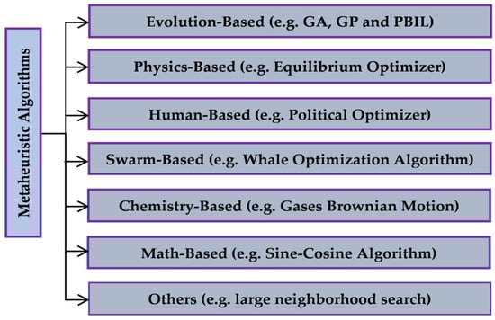 The chemistry-based metaheuristic algorithms in the fifth category are inspired by mimicking certain chemical laws; some of those algorithms are gases Brownian motion optimization (GBMO) [79], artificial chemical reaction optimization algorithm (ACROA) [80], and several others [81]. The sixth category, called math-based metaheuristics, is based on presenting metaheuristic algorithms inspired by simulating certain mathematics functions like the golden sine algorithm (GSA) [82], base optimization algorithm (BOA) [83], and sine–cosine algorithm [84]. Table 1 presents the category and inspiration of some of the recently-published metaheuristic algorithms―specifically published over the last three years.