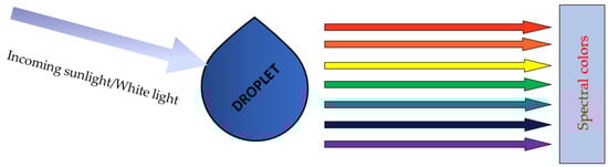 According to Descartes’s laws [111,112], refraction occurs when the light rays travel from one material to another with a different refractive index. When light rays hit the outer surface of a droplet, some light rays reflect away from the droplet while the others are refracted. The refracted light rays hit the inner surface of a droplet, causing another reflection and refracting away from the droplet with different angles, which causes the white sunlight to be dispersed into its seven spectral colors: red, orange, yellow, green, blue, indigo, and violet, as depicted in Figure 2. These spectral colors, differs according to the angles of deviations, which range from 40° (violet) to 42° (red) [113,114] (See Figure 2).