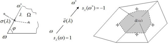 For grids of the support operators method, consisting of cells , formed by nodes , faces and edges , it is characteristic that there is an isolated conjugate grid (“shifted”) consisting of domains around nodes (see Figure 1).