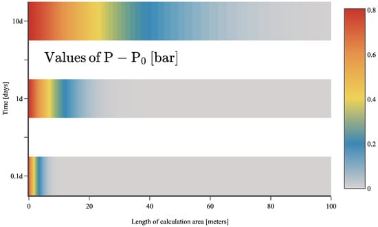 Pressure profile of deviation from initial pressure value , bar (—initial value, P—instantaneous value), for time moments days. X-axis: calculation length in horizontal direction of the reservoir is taken long way from the fault (up to 100 m), where 0 X-value represents the fault.