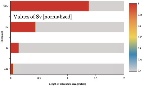 Water saturation profile in the area of the fault for the time moments days. X-axis: calculation length in horizontal direction of the reservoir is taken close to the fault (up to 2 m), where 0 X-value represents the fault.