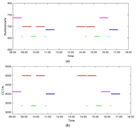 The diagram of the changes in the dual-parameter regulation strategy varying with time. (a) The changes in illuminance. (b) The changes in CCT. The red lines correspond to the focused learning mode; the manganese violet lines correspond to the comfortable learning mode; the blue lines correspond to the soothing learning mode; and the green lines correspond to the rest mode.