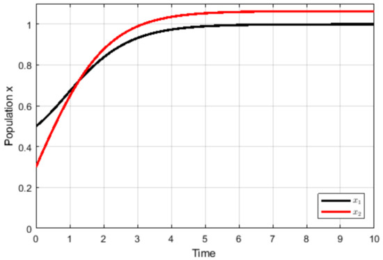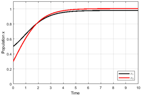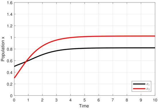 In this section, MATLAB software is used to numerically explore the dynamic behavior of the system . To obtain the real values of the intrinsic growth rate (), the intraspecific competition coefficient (), and the attenuation rates (), an empirical study is needed, with a concrete species and a controlled noisy environment. For the purposes of our research, we illustrate the results of our theoretical model using arbitrary selected values.