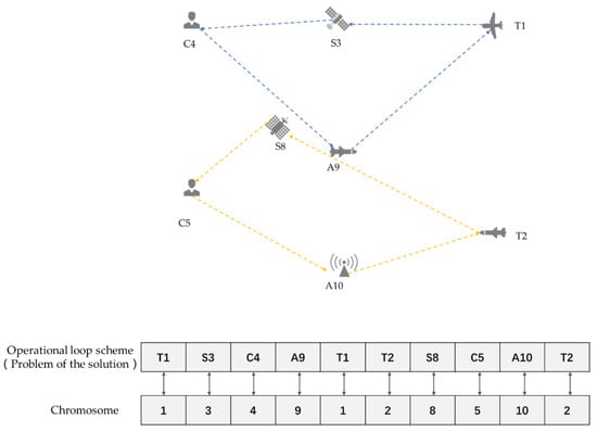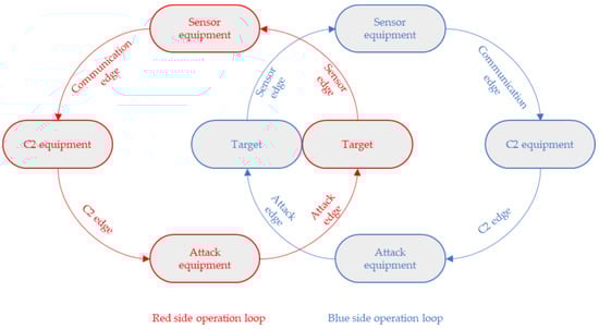 The modern combat cycle theory states that the combat process is a cyclic process composed of observation, orientation, decision, and action (OODA) [25]. According to the combat cycle theory, Professor Tan put forward the concept of the operation loop—that is, the closed loop composed of a sensor, C2 (command and control), attack and other equipment entities, and the enemy target entity [4]. Among them, the sensor entity finds the enemy target and transmits the relevant information to the C2 entity, the C2 entity sends commands to the attack entity after analysis, and the attack entity attacks the enemy target after receiving the attack command [4]. Both warring sides build their own operation loops and regard the enemy’s nodes as targets in their own operation loops. A schematic diagram of the operation loops in engagement is shown in Figure 1, where red and blue are sides in combat. Generally, red represents our side, and blue represents the enemy side. According to the definition of the operation loop, it is necessary to model the nodes and edges between nodes.