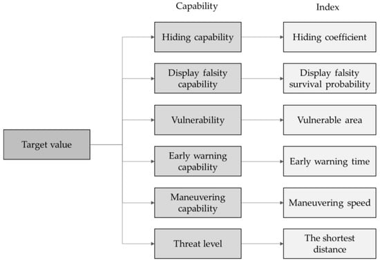 The target value includes both attribute values and system values [30]. Since the object of this study is the kill web, and the combination of kill web equipment varies, it is difficult to obtain the system value. This study only evaluates the target value from the perspective of attribute values. Target attribute value evaluation is a multi-criteria decision-making problem. Therefore, it is necessary to construct the index system first. Combined with the description of target node attributes in Section 2.1.1, the evaluation index system of the target value can be constructed, as shown in Figure 2, and the description of evaluation index is displayed in Table A1 in Appendix A.