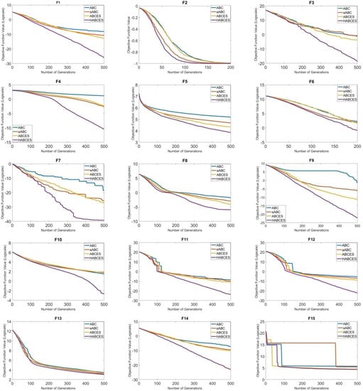 Comparison of the convergences of the ABC, aABC, ABCES and HABCES algorithms when solving high-dimensional global optimization problems (F1–F15).