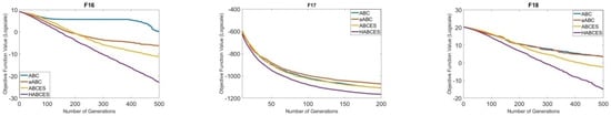 Comparison of the convergences of the ABC, aABC, ABCES and HABCES algorithms when solving high-dimensional global optimization problems (F16–F20).