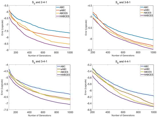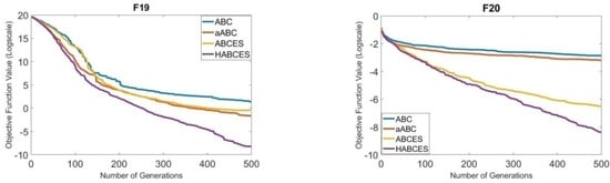 The most successful algorithm for F14 was the HABCES algorithm. Generally, large fitness values were achieved for F15. The best result was 8.0 × 101 and was obtained when using the HABCES algorithm. The most successful algorithm after HABCES was ABCES. Its fitness value was 9.3 × 101. For F16, the difference between the fitness values of the HABCES algorithm and the ABC algorithm was very large. The HABCES algorithm was better than the other algorithms tested here. The optimal value of F17 was −1174.98. Only the HABCES algorithm reached this value. The best result after the HABCES algorithm was obtained with aABC algorithm. The best fitness value for F18 was found to be 3.1 × 10−7, and was obtained when using the HABCES algorithm. For F19 and F20, the HABCES algorithm was more effective than the other algorithms.