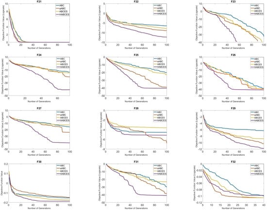 Comparison of the convergences of the ABC, aABC, ABCES and HABCES algorithms when solving low-dimensional global optimization problems (F21–F32).
