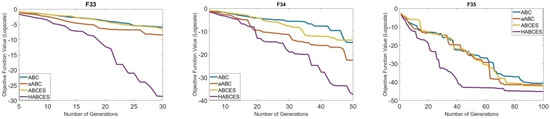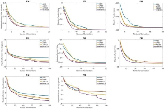 Comparison of the convergences of the ABC, aABC, ABCES and HABCES algorithms in solving low-dimensional global optimization problems (F33–F43).