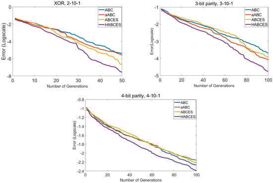 Comparison of the convergences of the ABC, aABC, ABCES and HABCES algorithms when solving parity problems.