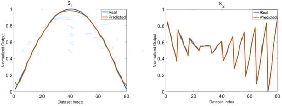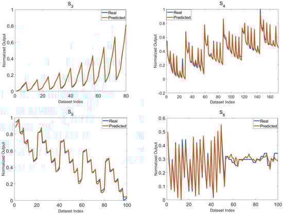 Secondly, the performance of the HABCES algorithm was analyzed with respect to the identification of nonlinear static systems. The information regarding the nonlinear static systems used is given in Table 5. S1 has one input. S2 and S3 have two inputs. S4 and S5 have three inputs. S6 has four inputs. All systems have one output. Neural networks with 4, 8 and 12 neurons in the hidden layer were used for each system. Colony size and the maximum number of generations belonging to the training algorithms were taken as 20 and 1000, respectively. In general, 80% of the data were used for the training process. The rest was reserved for the testing process. The results obtained when using the HABCES algorithms for nonlinear static system identification are given in Table 6. It can be seen that both the training and test results for S1 improve in parallel with increasing numbers of neurons. The best results were found when using the 1-12-1 network structure. The best training and test error values were 0.00072 and 0.00161, respectively. The effect of the number of neurons on performance was the same for S2 as it was for S1. The best training error value found was 0.00058. Additionally, the best test error value obtained was 0.00453. Increasing the number of neurons in S3 worsened the solution quality. The best error values for the training and testing process were found when using the 2-4-1 network structure. The error values were 0.00014 and 0.00297, respectively. In S4, the 3-8-1 network structure was more effective than the others. The training error value of the 3-8-1 network structure was 0.00154. The test result was also 0.00207. The best results for S5 were obtained with a network including four neurons in the hidden layer, similarly to the case of S3. The training and test error values for S5 were 0.00082 and 0.00463, respectively. Reducing the number of neurons in S6 improved performance. Effective results were achieved with the 4-4-1 network structure. The best training error value for S6 was 0.00148. Additionally, the test error value was 0.001563. Table 7 compares the results obtained when using the ABC, aABC, ABCES and HABCES algorithms for nonlinear static system identification. For all systems, the best training error value was found when using the HABCES algorithm. Other than for S1 and S6, the best test results were obtained when using the HABCES algorithm. The best test results for S1 and S6 were obtained by using the aABC algorithm. Table 8 shows the increase in performance achieved when using the HABCES algorithm. The HABCES algorithm provided a performance improvement of up to 69.57% compared to using the ABC algorithm for the training process. For the test process, this rate was 35.29%. With respect to the aABC algorithm, performance improvements of up to 54.84% (training) and 23.05% (test), respectively, were achieved. When comparing the HABCES algorithm with the ABCES algorithm, effective performance increases can be observed. A performance increase of up to 32.56% was achieved for training. For the test process, this rate was 54.11%. Figure 6 presents a comparison of the convergences of the ABC, aABC, ABCES and HABCES algorithms. For all systems, the HABCES algorithm obtained effective results by achieving fast convergence. In particular, the convergence speeds for S1, S2, S3, S5 and S6 were much better than those of the other algorithms. In some iterations of S4, the ABCES and the HABCES algorithms came close to one another. A comparison of the real output and the predicted output for all nonlinear static systems is given in Figure 7. It can be seen that the real and predicted outputs overlap with each other for all systems. This is an indication that the HABCES algorithm can successfully solve the corresponding problems.