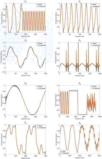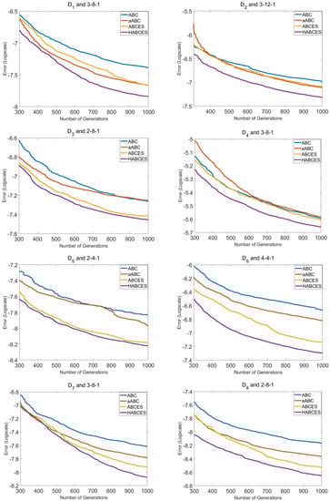 Thirdly, the algorithms were applied for the identification of nonlinear dynamic systems. Eight nonlinear dynamic systems were used. The nonlinear dynamic systems utilized are presented in Table 9. D3, D5 and D8 consist of two inputs. D1, D2, D4 and D7 have three inputs. D6 consists of four inputs. Except for D6, 80% of the data were used for training. The rest were designated for the testing process. For D6, these rates were 90% and 10%, respectively. Network structures with 4, 8 and 12 neurons in the hidden layer were utilized. The colony size and maximum number of generations used were 20 and 1000, respectively, as in the identification of nonlinear static systems. The results obtained using the HABCES algorithms in nonlinear dynamic system identification are given in Table 10. The best training and test error values for D1 were obtained using the 3-8-1 network structure. The related error values were 0.00039 and 0.00072, respectively. Increasing the number of neurons in D2 decreased the error value. The best results were obtained when using the 3-12-1 network structure. The training error value for the 3-12-1 network structure was 0.00066. The test error value was 0.00082. The most effective results for D3 and D4 were obtained when using network structures featuring eight neurons in the hidden layer. The training error values of D3 and D4 were 0.00057 and 0.00348, respectively. In addition, their test error values were 0.00070 and 0.00367, respectively. For D5, effective results were generally found when using all network structures. The 2-8-1 network structure was slightly more successful than the others. Increasing the number of neurons in D6 decreased performance. Namely, the results got worse. The best training and testing results were obtained when using the 4-4-1 network structure. The best training error value of D6 was 0.00067. The test error value was also 0.00105. The 3-8-1 network structure was effective for D7. There was a clear difference between the error values obtained for 3-8-1 and those obtained for the other network structures. The best training and test error values for D7 were 0.00030 and 0.00050, respectively. According to the training and test results in D8, the 2-8-1 network structure is more effective. The best training error value obtaind for D8 was 0.00017. The test error value was 0.00031. The performance of the HABCES algorithm was compared with the ABC, aABC and ABCES algorithms, and the results are presented in Table 11. It can be seen that the HABCES algorithm is better than the others with respect to the values of training and test error for all systems. A serious increase in performance was achieved when using the HABCES algorithm. The performance increase rates according to the systems are given in Table 12. With the HABCES algorithm, a performance increase of up to 46.82% was achieved in the training process compared to when using the ABC algorithm. This ratio was 39.53% for the test. Compared to the aABC algorithm, the HABCES algorithm achieved performance improvements of up to 37.96% and 35.00%, respectively, for the training and testing processes. At the same time, the HABCES algorithm was more successful than the ABCES algorithm. With respect to the ABCES algorithm, a 20.48% performance increase was achieved in the training process. For the testing process, this ratio was 25.77%. Figure 8 presents a comparison of the convergences of the ABC, aABC, ABCES and HABCES algorithms. In D1, D2, D4, D6, D7 and D8, the HABCES algorithm showed a rapid convergence and reached effective solutions in a short time. In D3 and D5, the HABCES and ABCES algorithms had good convergence. A comparison of the real output and the predicted output for nonlinear dynamic system identification is given in Figure 9. It can be understood from the overlapping output graphics that successful modeling for all systems was achieved when using the HABCES algorithm.