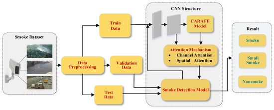 An efficient smoke detection method that combines an attention mechanism with a novel upsampling algorithm has been proposed to address small and thin smoke detection in the early stage of fire. As seen from Figure 1, firstly, offline videos of common combustibles were taken just as they were starting to burn. Then, the original video data were preprocessed to obtain data in the form of images. The normal smoke dataset in different scenarios and the smoke-free dataset in different scenarios were combined to form a complete smoke dataset, divided into training, validation, and test datasets. Next, based on the YOLO v5s network, the structure of the convolutional neural network was redesigned, and an attention mechanism combined with spatial and channel has been added. The attention mechanism is used after the C3 module in feature fusion. Next, the first upsampling of the feature fusion network has been replaced with a novel upsampling CARAFE. Then, the training set was used to train the new convolutional neural network to obtain the smoke detection model. Finally, the smoke detection model types are normal smoke, small smoke, and non-smoke.