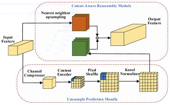 - Wang, J.; Chen, K.; Xu, R.; Liu, Z.; Loy, C.C.; Lin, D. CARAFE: Content-Aware ReAssembly of Features. In Proceedings of the 2019 IEEE/CVF International Conference on Computer Vision (ICCV), Seoul, Korea, 27 October–2 November 2019; IEEE: Washington, DC, USA, 2019; pp. 3007–3016. [Google Scholar]